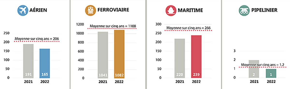 Aujourd’hui, le Bureau de la sécurité des transports du Canada (BST) a rendu public un résumé des statistiques préliminaires sur les événements de transport de 2022, qui montrent que le numéro d’accidents est inférieures à la moyenne quinquennale pour tous les modes de transport.