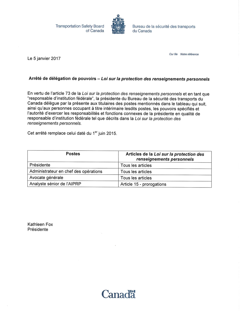 Une délégation de pouvoir a été établie, comme l’exige la Loi. Aux fins de la Loi sur la protection des renseignements personnels, le « responsable d’une institution fédérale », en vertu de l’article 3 de la Loi, est la présidente du BST. La présidente a délégué, aux personnes occupant les postes d’administrateur en chef des opérations, d’avocate générale et d’analyste principal de l’AIPRP, les pouvoirs jugés nécessaires pour l’administration efficace de la Loi. Ces employés s’assurent que le BST s’acquitte de toutes ses obligations de façon équitable et uniforme. La délégation de pouvoirs est demeurée inchangée en 2018-2019. Un exemplaire de l’ordonnance de délégation de pouvoirs se trouve à l’annexe A.