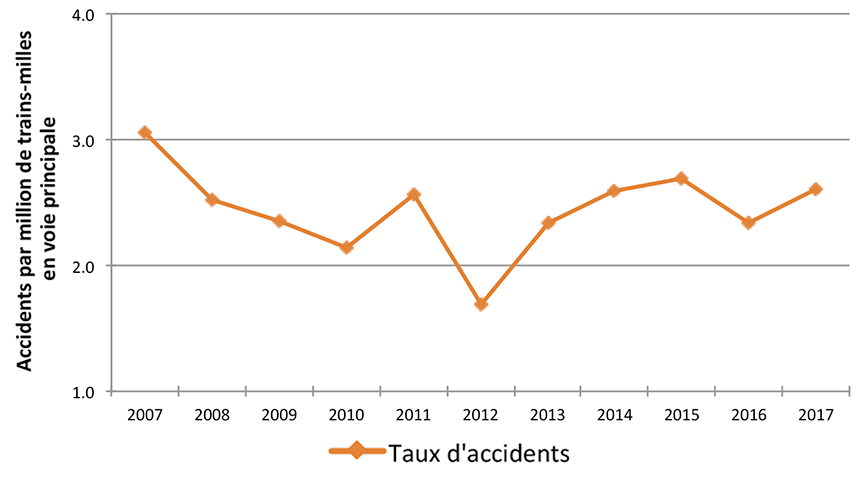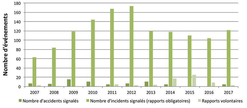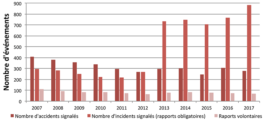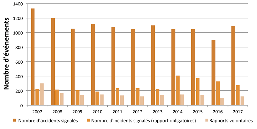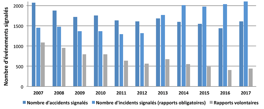 Après une tendance constamment à la baisse depuis 2013, le nombre total d'événements signalés a augmenté en 2017, malgré des améliorations dans certains secteurs.Note de bas de page 1 En 2017, 1614 accidents et 2210 incidents ont été déclarés conformément à la réglementation du BST sur la déclaration obligatoire d'événements (figure 2).Note de bas de page 2