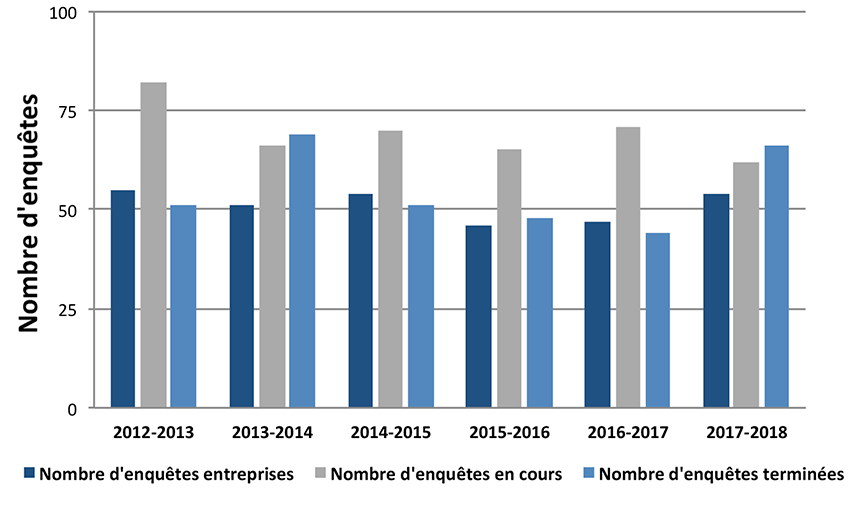 En 2017-2018, le BST a déclenché une enquête pour 54 des événements signalés (tableau 1). Au cours de la même période, il a terminé 66 enquêtes, comparativement à 44 l'année précédente.Note de bas de page 4 À la fin de l'exercice, il y avait 62 enquêtes en cours, alors qu'il y en avait 71 au début (figure 3). La durée moyenne d'une enquête était de 503 jours en 2017-2018, comparativement à 569 jours en 2016-2017, et à une moyenne de 527 jours pour les cinq années précédentes. La réduction de la durée moyenne au cours de la dernière année est attribuable aux efforts que le BST a déployés pour simplifier ses processus et améliorer son approche de gestion des projets.