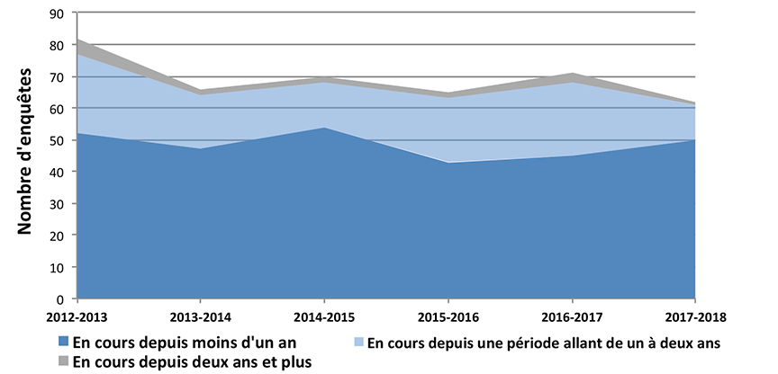 La figure 4 montre le nombre d'enquêtes en cours au 31 mars pour les six derniers exercices selon le temps écoulé depuis le début de l'enquête. En 2017-2018, l'accroissement des enquêtes en cours depuis moins d'un an et la diminution correspondante du nombre d'enquêtes en cours depuis plus longtemps résultent des efforts du BST pour améliorer la durée des enquêtes.