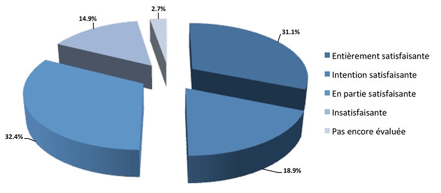 Le Bureau a accordé la cote intention satisfaisante à 6,2 % des réponses. Cela indique que les agents de changement avaient pris ou avaient l'intention de prendre des mesures qui, une fois pleinement mises en œuvre, devraient corriger en grande partie les lacunes constatées. La cote en partie satisfaisante a été attribuée dans 9,6 % des cas, ce qui signifie que les agents de changement avaient pris ou avaient l'intention de prendre des mesures qui ne pourraient que partiellement remédier aux lacunes. Le Bureau a évalué 3,4 % des réponses comme étant insatisfaisantes, parce que les agents de changement n'avaient pas pris – ou n'avaient pas l'intention de prendre – des mesures en vue de corriger les lacunes constatées, ou parce qu'ils avaient mis trop de temps à mettre en œuvre les mesures prévues. Dans les autres cas, le Bureau n'avait pas reçu suffisamment d'information pour être en mesure d'évaluer les réponses, ou les recommandations étaient trop récentes pour qu'on ait pu procéder à une évaluation.