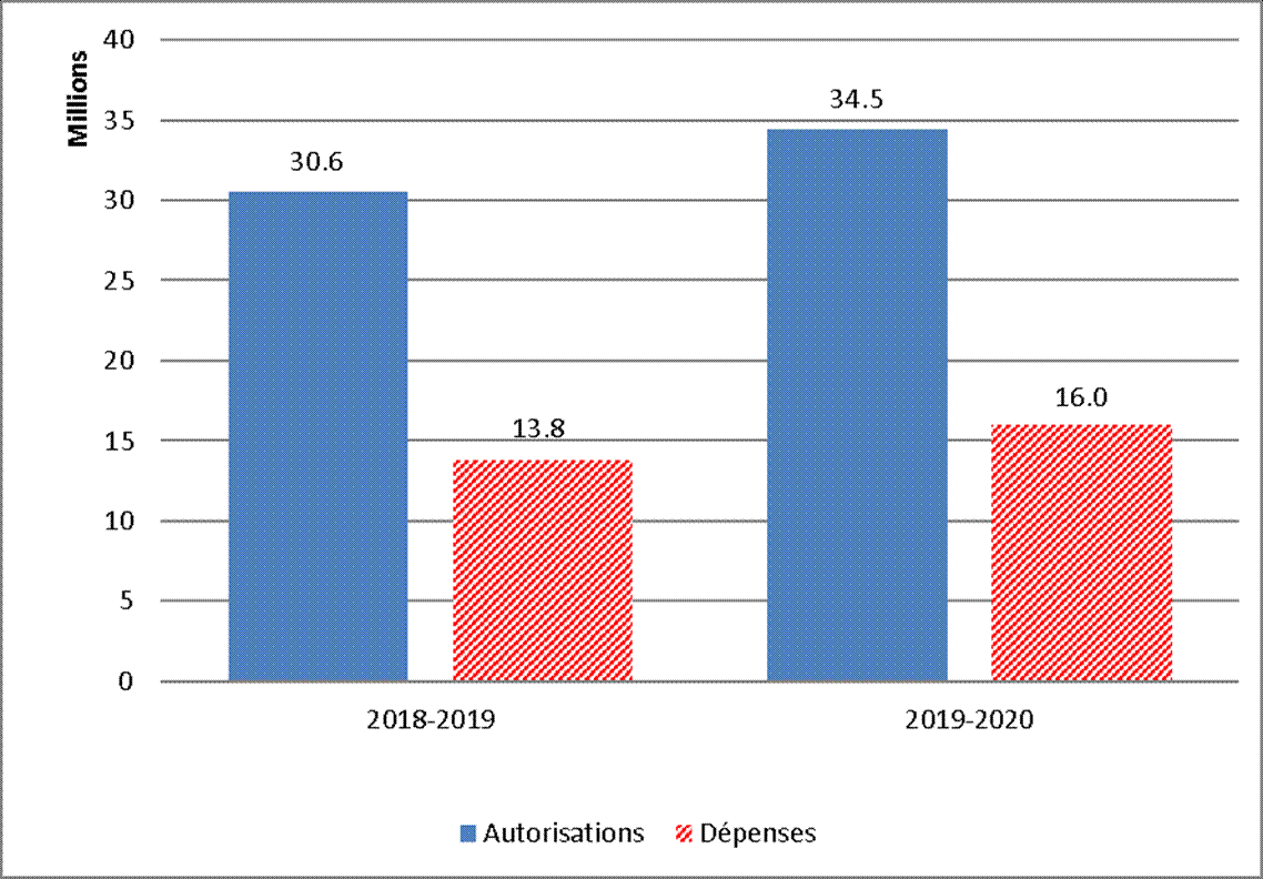 Le financement total accordé au BST a augmenté de 3 869 643 $ entre les exercices financiers 2018-2019 et 2019-2020. Cette augmentation est en majorité attribuable à une augmentation de 2 977 444 $ du financement permanent octroyé au BST au cours du troisième trimestre de 2018-2019. Ces fonds supplémentaires ont été obtenus grâce à une présentation au Conseil du Trésor qui visait à atténuer les contraintes de financement liées à l’intégrité des programmes du BST. Cette augmentation s’explique également par une augmentation dans le RBF de 762 197 $ comparativement à l'année précédente. Le reste de l’augmentation est attribuable au rajustement de la rémunération associée au renouvellement des conventions collectives; ces rajustements de la rémunération ont été compensés par un taux moindre prévu pour le régime d’avantages sociaux des employés (RASE). Ce taux fluctue d’une année à l’autre et est fixé annuellement par le Secrétariat du Conseil du Trésor.
