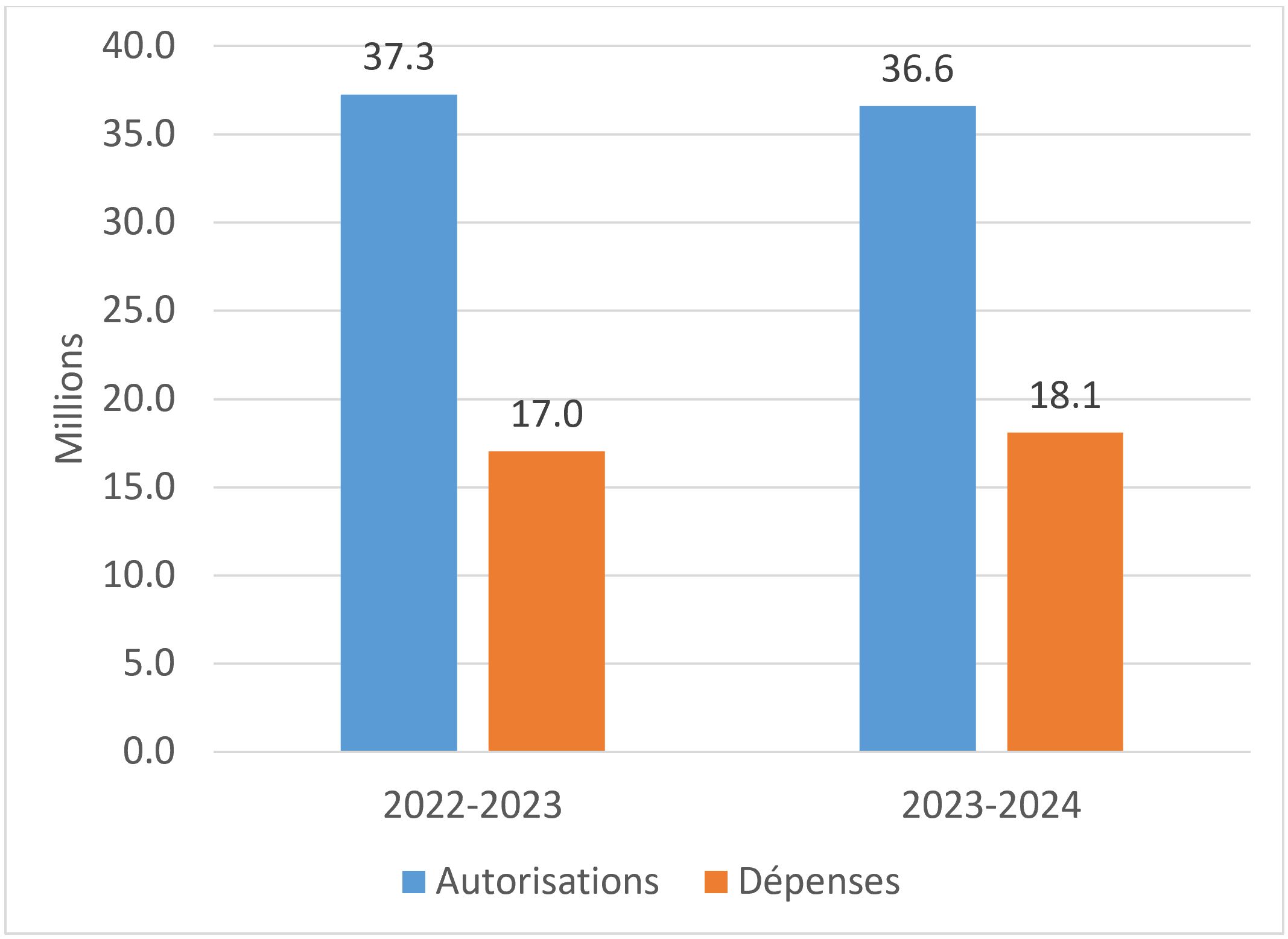 Le montant total des autorisations disponibles pour utilisation du BST ont diminué de 674 000 dollars entre les exercices financiers 2023-2024 et 2022-2023. Cette variation s'explique principalement par le financement de 615 000 dollars reçu en lien avec le programme de Laboratoires Canada en 2022-2023, mais qui n'a pas été reçu pour l'exercice financier en cours. Pour 2023-24, une nouvelle structure de financement a été convenue, selon laquelle la BST ne recevrait pas d'autorisations initiales pour le programme de Laboratoires Canada, mais plutôt un remboursement des dépenses engagées. La différence restante est principalement due aux fluctuations du pourcentage du taux prévu pour le régime d’avantages sociaux des employés (RASE). Ce taux fluctue d’une année à l’autre et est fixé annuellement par le Secrétariat du Conseil du Trésor.