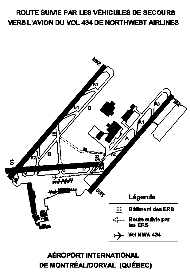 L'aéroport de Dorval comprend trois pistes : la piste 10/28 et les deux pistes parallèles 06/24. Le bâtiment des services d'intervention d'urgence est situé entre les deux pistes parallèles, et l'accès à leurs voies de circulation respectives, Alpha et Bravo, est direct. Ces deux voies de circulation coupent la troisième piste, la 10/28, et plus loin, l'aire de trafic avec ses deux bâtiments de l'aérogare qui sont tous parallèles à la piste 10/28. Il n'y a pas d'accès direct entre le bâtiment des services d'intervention d'urgence et l'aire de trafic. Une autre voie de circulation, la voie Echo, relie la voie de circulation Bravo à l'aire de trafic (voir l'annexe A.)