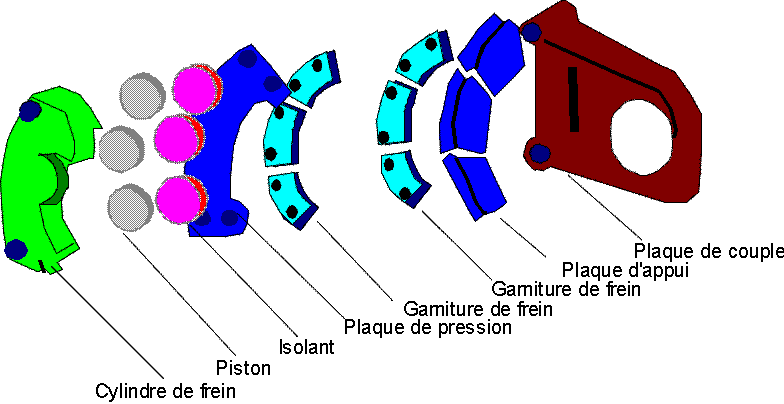 Plaque de pression du frein gauche : Trois garnitures de frein sont fixées à la plaque de pression et sont situées du côté du piston de frein du disque.