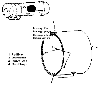 La chambre de combustion est entourée d'une enveloppe circulaire qu'on appelle enveloppe extérieure de la chambre de combustion (voir la figure 3). L'extrémité avant de l'enveloppe est fixée au carter du diffuseur qui est fixé à l'extrémité arrière de la section compresseur à l'aide d'un rebord et de nombreux boulons. L'extrémité arrière de l'enveloppe est fixée à l'avant de la section turbine à l'aide d'un ensemble rebord et boulons semblable. Le carburant est introduit et enflammé dans la chambre de combustion, et les gaz d'échappement sortent par la turbine puis par la tuyère d'éjection.