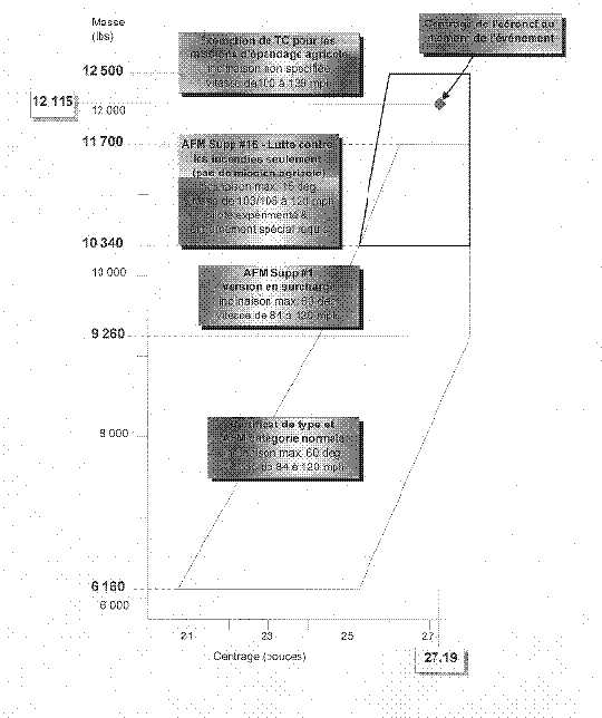 Plusieurs anomalies ont été relevées entre le manuel de vol de l'avion et le supplément au manuel de vol relativement aux vols à la masse de 12 500 lb (voir l'annexe B). La plage de centrage, les limites relatives au facteur de charge, et certaines des vitesses spécifiées dans le supplément au manuel de vol s'opposent aux limites du manuel de vol de l'avion qui sont plus restrictives pour les vols à une masse inférieure. Le supplément au manuel de vol ne précise aucune limite ni modification de performance en fonction des diverses configurations de l'avion, comme la configuration d'épandage. Les avertissements et les recommandations du constructeur contenus dans le manuel de vol concernant les vols à la masse de 11 700 lb, et l'interdiction de voler dans la configuration d'épandage à une masse supérieure à 10 340 lb, n'étaient pas mentionnés dans le supplément concernant les vols à la masse de 12 500 lb; la vitesse de vol maximale de 120 mi/h si l'avion est équipé de rampes de pulvérisation n'était pas indiquée non plus. Malgré ces anomalies, Transports Canada a accordé une dérogation au paragraphe 210(1) et à l'alinéa 218 a) du Règlement de l'Air, ce qui autorisait l'utilisation de l'avion à une masse supérieure à la masse autorisée par l'homologation de type du constructeur.