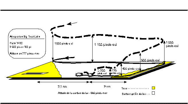 visuels et donnait des instructions au premier officier. À cinq milles environ de la piste, l'équipage a tourné pour se placer dans le prolongement de l'axe de piste, et il a reçu un compte rendu par radio de l'équipage de l'autre avion que la visibilité locale était inférieure à un demi-mille. Après avoir survolé en rapprochement une grande partie du lac, le commandant de bord a sorti les volets en vue de l'atterrissage. Peu après, le commandant de bord s'est inquiété parce que la visibilité avait diminué. Il a alors consulté la reliure à anneaux contenant les procédures d'approche de la compagnie, reliure qu'il avait placé sur ses genoux. Le commandant connaissait les dangers associés au voile blanc et avait l'intention de passer au vol aux instruments s'il rencontrait des conditions de voile blanc. Il n'avait pas enlevé la carte d'approche de Big Trout Lake de la reliure à anneaux pour la placer sur le porte-cartes d'approche parce que lors de son premier exposé sur l'approche il s'était rendu compte que les anneaux de la reliure étaient défectueuses et ne pouvaient être ouvertes. Il avait l'intention de donner de nouveaux renseignements sur l'approche au premier officier de sorte qu'une approche aux instruments complète puisse être entreprise à partir de leur position actuelle. Quand le commandant de bord a levé les yeux de la reliure, il a remarqué que l'altimètre affichait 1 000 pieds-mer en descente et il a donné instruction au premier officier de surveiller son altitude (Watch your altitude.). Avant qu'un redressement puisse être amorcé, l'avion a heurté la surface gelée du lac et a rebondi. Le commandant de bord a alors amorcé un redressement, puis, soucieux de l'état de navigabilité de l'avion, il a réduit les gaz et a tenté d'atterrir droit devant. L'avion a heurté la surface gelée du lac à environ 3/4 de mille après le point d'impact initial.