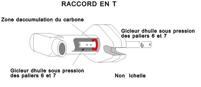 - La conception de l'ensemble raccord en té et tube favorise la formation de carbone dans la zone située entre la paroi intérieure du raccord en té et le gicleur d'huile sous pression des paliers 6 et 7.