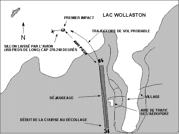 Note de bas de page 1 Note de bas de page 2Après le décollage, l'avion grimpe selon un angle inhabituellement faible, selon les déclarations des témoins au sol. Le personnel de la compagnie tente vainement de contacter le pilote par radio, puis il lance une opération de recherches au sol. Cinq minutes après l'accident, on trouve l'avion qui repose alors sur la surface gelée et enneigée du lac Wollaston, à environ trois quarts de mille marin (nm) de l'extrémité de départ de la piste, et à environ 1,3 nm du début de la course au décollageNote de bas de page 3.