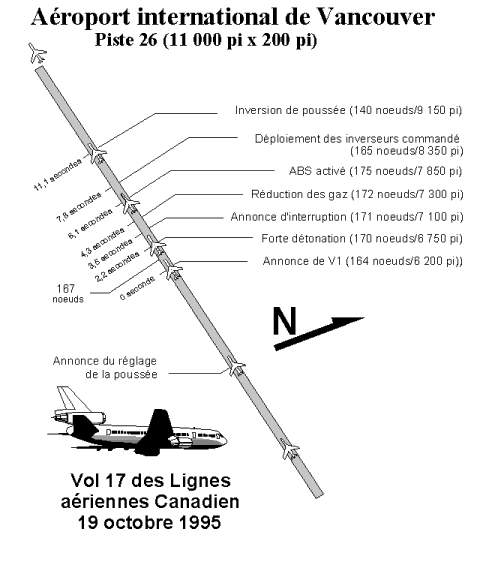 L'avion du vol 17 des Lignes aériennes Canadien International devait effectuer un vol régulier entre l'aéroport international de Vancouver et Taipei, à Taïwan. À bord se trouvaient 4 membres d'équipage de conduite, 8 agents de bord, 2 interprètes et 243 passagers. Au cours du décollage de la piste 26 et environ deux secondes après l'annonce de V1, l'équipage a entendu une détonation, la cellule a été fortement secouée et l'équipage a ressenti de fortes vibrations, ce qui a été attribué par la suite à un décrochage réacteur. Le commandant de bord a annoncé qu'il fallait interrompre le décollage. Après l'interruption de décollage, l'avion n'a pu s'arrêter sur la piste, et le train d'atterrissage avant s'est affaissé pendant que l'avion roulait sur le sol meuble au-delà de l'extrémité de piste. L'avion s'est immobilisé sur le nez à environ 400 pieds au-delà de l'extrémité de piste. Six passagers ont été légèrement blessés pendant l'évacuation d'urgence.