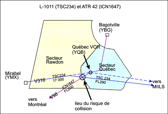 Le vol TSC 234 a été transféré au contrôleur de Lévis alors que l'avion était à 43 nm à l'ouest du VOR de Québec et à une altitude de 17 000 pieds. Le contrôleur de Lévis, conformément aux procédures, utilisait un filtre d'altitude de 5 000 pieds, ce qui ne lui permettait d'observer les avions qu'à partir du niveau de vol 240; le contrôleur de Lévis ne pouvait donc pas observer TSC 234 ni ICN 1647. À 00 h 13 min 32 s, le contrôleur de Lévis a autorisé TSC 234 au niveau de vol 290 et à se diriger directement vers MIILS, ce qui occasionne un virage à droite de 12 degrés, conformément aux procédures établies. Le contrôleur de Lévis a communiqué avec le contrôleur de Québec qui a répondu qu'il vérifiait TSC 234. À partir de ce moment, les deux appareils se sont trouvés sur des trajectoires de collision, ce qui a provoqué le déclenchement de leur système TCAS/ACAS vers 00 h 16 min 37 s, selon les données radar.