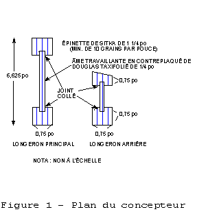 inférieures de longeron doivent avoir un pouce de hauteur et pouce de largeur, et elles doivent également être en épinette de Sitka. Les semelles de longeron principal doivent être reliées entre elles par une âme travaillante en Douglas taxifolié de 1/4 pouce de largeur.