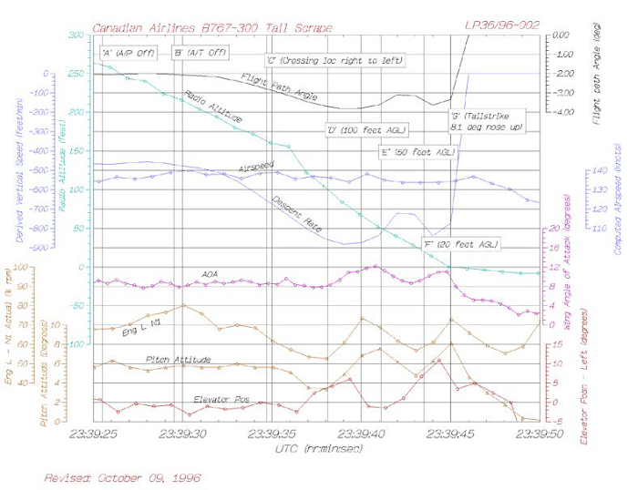 Le C de G à l'atterrissage était plus à l'avant qu'à l'accoutumée à cause du fret qui se trouvait dans la soute avant et du petit nombre de passagers. Plus le C de G de l'avion se trouve à l'avant, plus l'angle de cabré en approche est important. L'augmentation de l'angle de cabré entre un C de G à mi-plage et un C de G avant est de l'ordre de 0,75 degré.