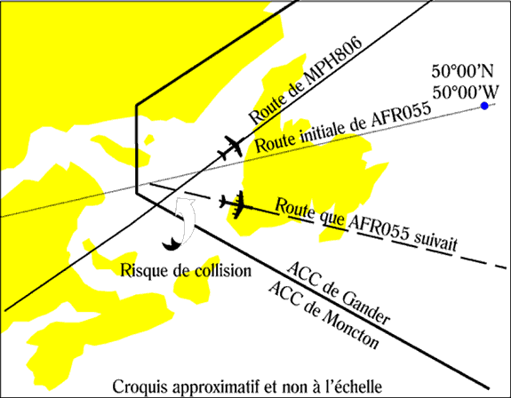 Le contrôleur du centre de contrôle régional (ACC) de Gander a pris en charge les vols MPH806 et AFR055 à la suite d'un transfert radar de l'ACC de Moncton. Peu de temps après, il a demandé à l'équipage du vol AFR055 de procéder directement vers St. John's (Terre-Neuve), ce qui a donné lieu à un changement de cap de 20 degrés environ en direction de la route suivie par l'avion du vol MPH806. Les deux avions ont continué à converger à la même altitude jusqu'à ce qu'il n'y ait plus que trois milles de distance entre eux. À ce moment-là, les équipages des deux appareils ont reçu un avis de résolution (RA) de leur TCAS/ACAS (Système d'avertissement de trafic et d'évitement d'abordage). L'équipage du vol MPH806 s'est alors mis en montée tandis que l'équipage du vol AFR055 se mettait en descente. Les deux avions se sont croisés avec un espacement vertical de 1 200 pieds environ et un espacement latéral d'un quart de mille. L'espacement obligatoire est de 2 000 pieds verticalement ou cinq milles latéralement.