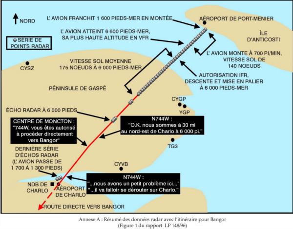 Le dimanche 20 octobre 1996, le Chieftain, avec à son bord un pilote et sept passagers, décolle de Port-Menier à 11 h 13, heure avancée de l'Atlantique (HAA)Note de bas de page 1, pour se rendre à Bangor (Maine) selon un plan de vol établi suivant les règles de vol aux instruments (IFR)Note de bas de page 2. Le plan de vol indique que l'avion doit se rendre directement à Charlo (Nouveau-Brunswick), directement à Houlton (Maine), et directement à Bangor en maintenant une altitude de 6 000 pieds. Le Caravan, qui transporte les bagages et le fret, a décollé une dizaine de minutes plus tôt et doit suivre le même itinéraire prévu au plan de vol à une altitude de 8 000 pieds.