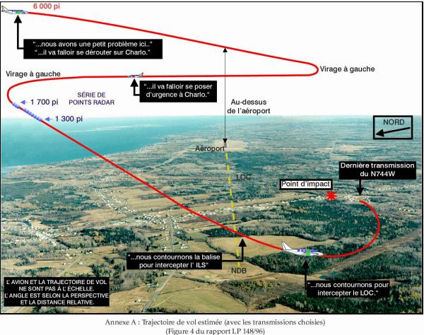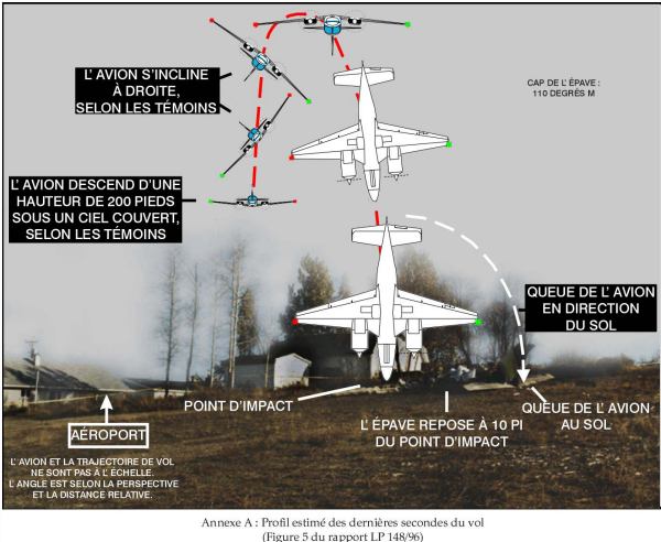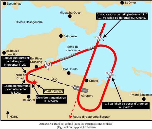 L'avion s'est écrasé dans l'agglomération d'Eel River Crossing, à quelque 3 nm à l'ouest de l'aéroport de Charlo. Avant de s'écraser, l'avion a été vu et entendu alors qu'il se dirigeait vers l'ouest, en éloignement de l'aéroport, dans un épais brouillard, à une altitude inférieure à 200 pieds. Des témoins ont déclaré avoir entendu un bruit comme celui d'un moteur qui fonctionne mal. Des témoins ont vu l'avion s'incliner à droite, passer sur le dos et piquer droit vers le sol où il s'est écrasé dans une assiette presque verticale. L'avion a aussitôt pris feu et a été consumé par l'incendie. Le pilote et les sept passagers ont subi des blessures mortelles au moment de l'impact avec le sol.