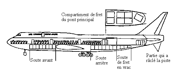 Le dessous du fuselage présentait un gondolement léger au niveau de l'empennage entre les références fuselage 2658 à 2742 parce que cette partie de l'avion a raclé la piste. Dans cette zone se trouvent les panneaux d'accès au groupe auxiliaire de bord (APU) et la partie située légèrement à l'arrière des portes.