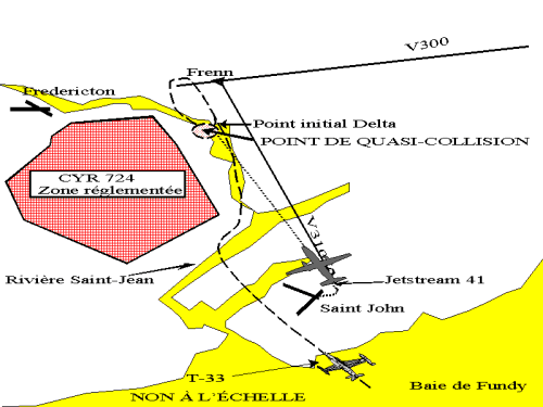 « en visuel, autour du camp ». Le Centre de contrôle régional (ACC) de Moncton lui accorde cette autorisation. Pourvu que la rivière coule du côté gauche de l'avion, l'équipage est assuré de rester à l'écart de la zone réglementée CYR 724 de Gagetown (voir l'annexe A). Cette route permet au Jetstream de demeurer dans l'espace aérien protégé conçu pour la route directe vers l'intersection Frenn (voie aérienne V310); toutefois, l'avion se trouve à 1,6 mille marin à gauche de l'axe de la voie aérienne. Il s'agit d'un écart par rapport à l'exigence IFR qui stipule que l'avion doit suivre le plus près possible l'axe de la route autorisée. Depuis un certain nombre d'années, cette procédure ad hoc « en visuel, autour du camp » est une pratique courante IFR lorsqu'il y a des conditions météorologiques de vol à vue entre Saint John et Fredericton. La route commence habituellement vers l'intersection Frenn, mais tourne à gauche avant d'atteindre l'intersection et suit le côté droit de la rivière jusqu'à Fredericton.