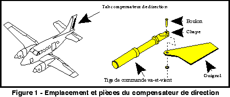Une molette dans le poste de pilotage doit être tournée pour compenser la gouverne de direction. Ce mouvement est converti en un déplacement longitudinal de la tringle va-et-vient. Celle-ci, fixée à l'aide d'une chape et d'un boulon à un guignol sur le côté droit du compensateur de direction, déplace le compensateur vers la gauche ou la droite. La gouverne de direction bascule alors dans le sens contraire, ce qui atténue les forces à exercer sur les commandes pour maintenir l'avion en vol coordonné (figure 1).