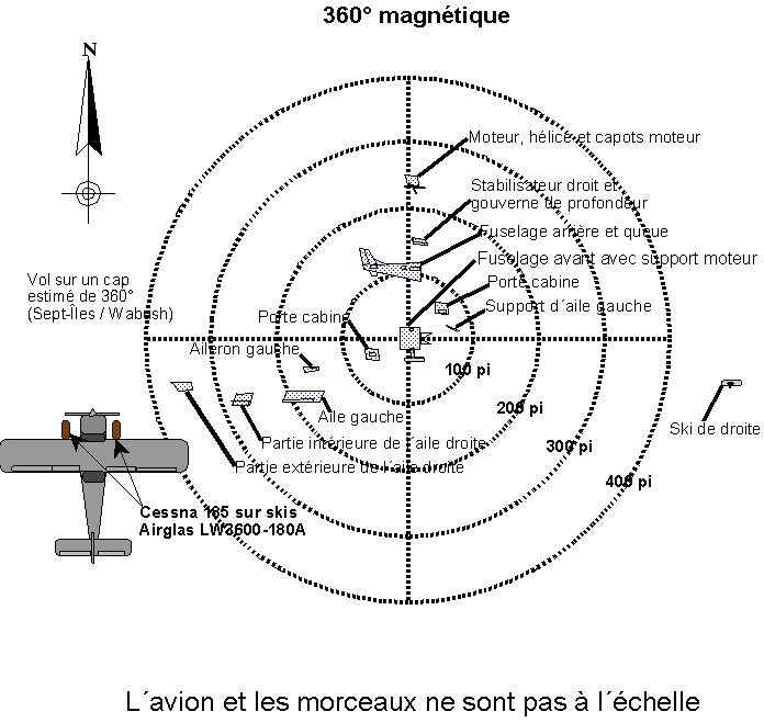 À l'exception du train d'atterrissage droit retrouvé le 20 mai 1997, toutes les composantes majeures de l'appareil ont été retrouvées au cours des premiers jours de l'enquête. L'appareil a été acheminé au Laboratoire technique du BST pour une analyse approfondie. La répartition des pièces au sol ainsi que l'absence d'indication de vitesse longitudinale sont typiques d'une désintégration en vol. Voir le schéma de la répartition des débris à l'annexe A.
