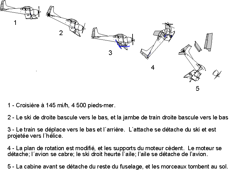 Lorsque le moteur s'est détaché, l'appareil s'est cabré sous l'effet des forces aérodynamiques et la modification du centrage. Le ski a alors coupé le hauban de l'aile droite ainsi que le bord d'attaque jusqu'au longeron principal. Pendant cette séquence, la structure traversante avant a été endommagée, facilitant ainsi la séparation des deux ailes. Finalement, en l'absence d'une structure forte, le fuselage s'est séparé au niveau de la structure arrière de la porte. Des marques de peinture provenant du ski ont aussi été relevées sur la dérive ainsi que sur la gouverne de profondeur gauche, ce qui suggère que le fuselage a fait des tours vers la droite après avoir perdu l'aile droite. Après une descente de près de 3 500 pieds, les divers morceaux de l'avion se sont écrasés au sol.