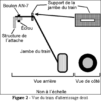 La figure 2 représente l'installation d'une jambe de train d'atterrissage sur le Cessna 185. Lorsque la jambe de train ne repose pas au sol, le boulon force en tension, sinon il sert de guide pour maintenir l'assemblage en position. Après l'accident, du côté droit de l'appareil, la partie supérieure du support de la jambe du train d'atterrissage était arrachée tandis que la partie inférieure externe montrait des signes de compression. La partie du plancher située au-dessus de la structure de l'attache du ski avait été défoncée par l'extrémité de la jambe du train d'atterrissage. Il y a un trou dans la structure de l'attache pour recevoir le boulon de type AN-7. À l'intérieur du trou et vers le fuselage, les filets ont laissé une marque distincte. Le nombre de filets correspond à celui observée lorsque l'écrou est vissé jusqu'au verrou de fibre. La partie inférieure de la structure de l'attache présentait des marques de forme hexagonale rappelant la forme de l'écrou. Ces marques d'écrou ainsi que les marques de filets n'ont pas été observées sur la structure de l'attache du train d'atterrissage gauche.