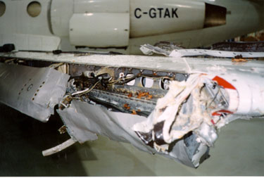 L'aile gauche a subi les dommages suivants : quelque trois pieds du bord d'attaque basculant situés dans la partie extérieure ont été arrachés et se sont recourbés sous l'aile, le revêtement d'intrados du prolongement extérieur de l'aile a été tordu. L'aileron et le panneau de volet extérieur ont été légèrement endommagés. Les bords d'attaque basculant et fixe de la partie intérieure de l'aile gauche présentaient plusieurs marques d'impact importantes.