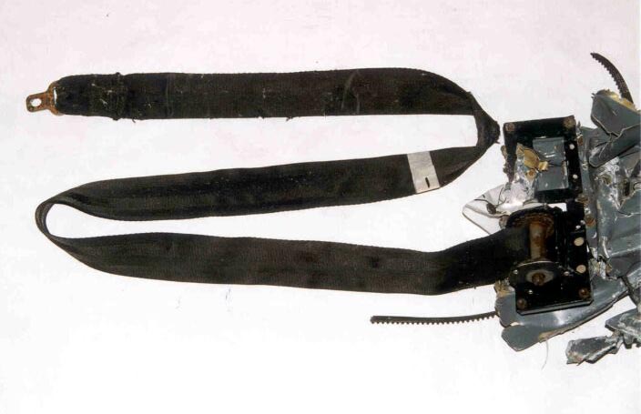 Les raccords métalliques déformés des ceintures de sécurité et le raccord métallique brisé de la sangle de g négatif laissent croire que le siège était occupé et que les cinq ceintures et bretelles étaient attachées au moment de l'impact.