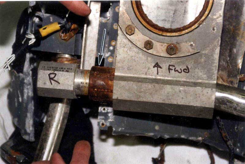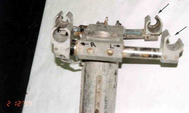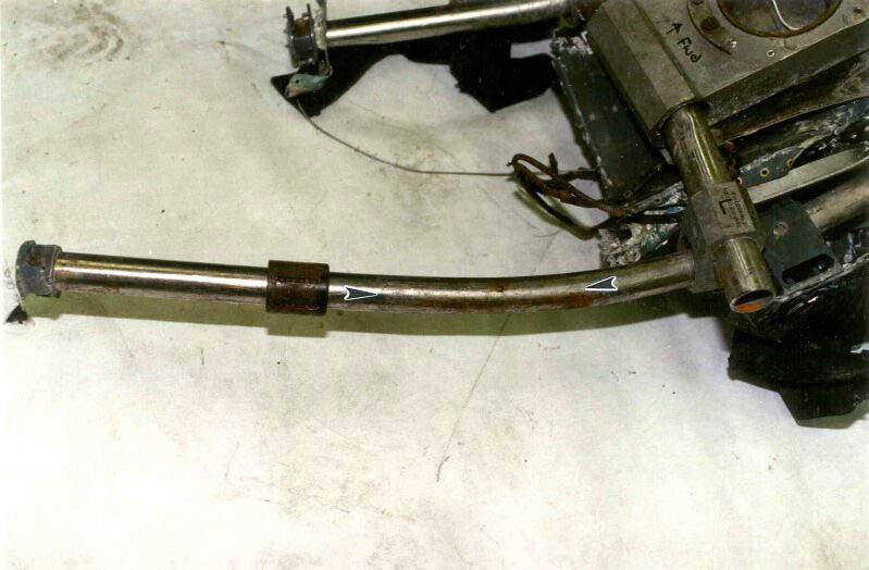 Lorsque le dommage du tube avant est aligné avec le support, sa position laisse croire que le siège se trouvait près de l'extrémité gauche de sa course normale. La position du tube arrière laisse croire que le siège se trouvait près de l'extrémité droite de sa course normale. Par contre, des rainures ont été observées sur l'extrémité droite du tube arrière. Lorsque ces rainures étaient alignées avec le support, leur position laissait croire que le siège se trouvait près de l'extrémité gauche de sa course normale. Un roulement avait aussi été expulsé du côté droit du support.