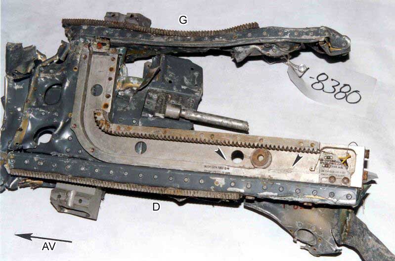 Il y avait d'importantes rainures près de l'extrémité de la longue branche du rail en forme de L. Ces rainures sont à peu près alignées avec l'endroit où se trouverait le pignon du mécanisme de déplacement horizontal lorsque le siège est en position avancée. Il n'y avait aucune rainure semblable à l'avant du rail en forme de L, où se trouverait le pignon du mécanisme de déplacement horizontal si le siège se trouvait dans la position permettant de le quitter. Une section de crémaillère était manquante à la suite d'un bris, mais le profilé était intact.