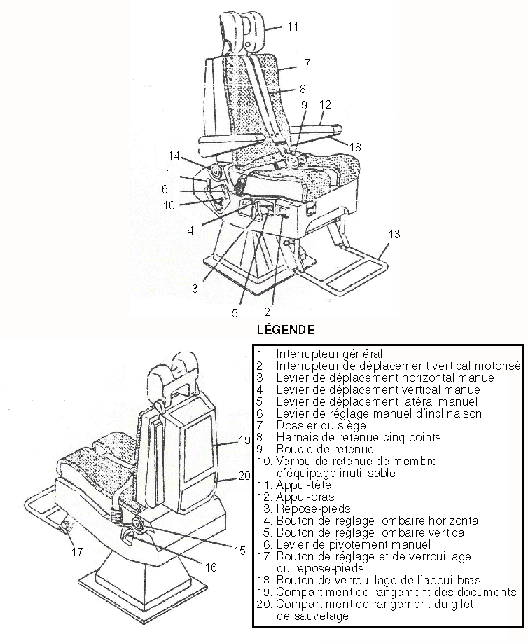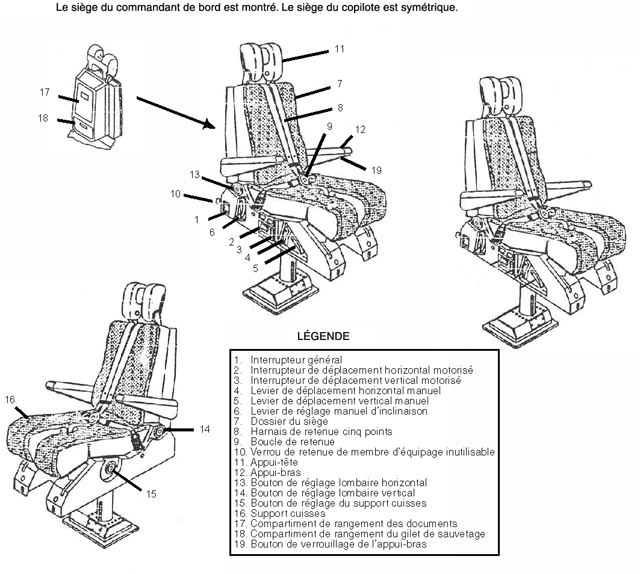Le siège du commandant de bord et celui du copilote sont construits au moyen de pièces symétriques, y compris les mécanismes suivants :