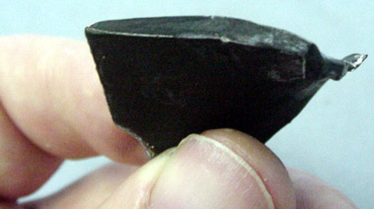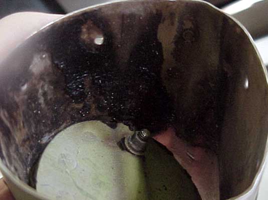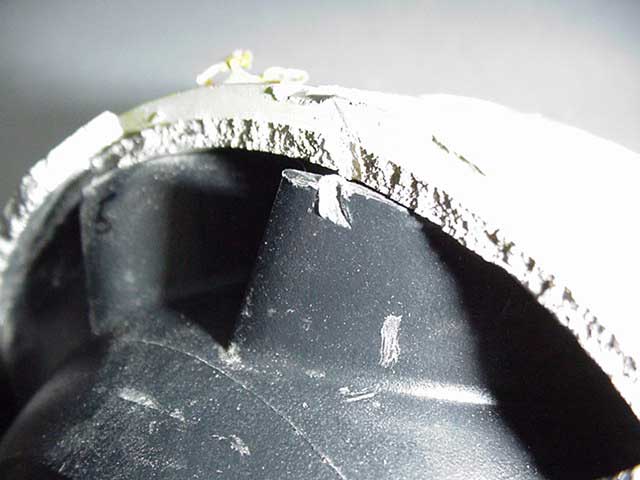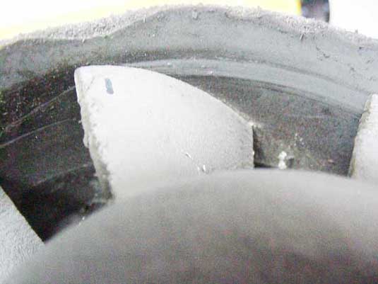 Une profonde rainure en forme d'arc a été décelée sur le dessous du rouet; elle correspondait au rebord brisé du boîtier du moteur.