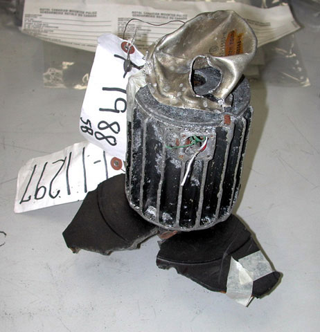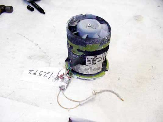 Le carter du ventilateur et le moyeu de la roue à aubes ont été récupérés séparément. Le moteur électrique du ventilateur n'a jamais été retrouvé. Le carter du ventilateur présentait de graves dommages.