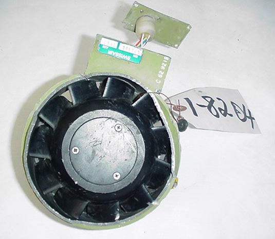 Ce ventilateur a été récupéré d'un bloc. Il a été identifié par le catalogue illustré des pièces comme portant le numéro de pièce 605457-8. Le moyeu du rouet centrifuge en composites était fixé au moteur. Les aubes du rouet, la périphérie extérieure du rouet et la bride du boîtier du moteur avaient été brisées.