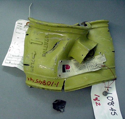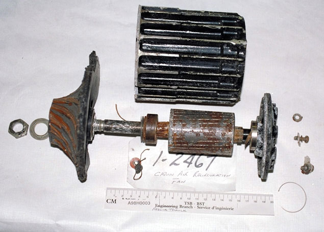 Au moment de sa récupération, le ventilateur était intact et il se trouvait toujours dans sa structure de fixation. L'étiquette apposée sur le ventilateur portait la mention suivante : EG&G Rotron PN 034964, SN AFN377. Le boîtier extérieur portait de légères éraflures au niveau du passage de l'extrémité des aubes. On a également retrouvé des débris de l'avion en aval des aubes.