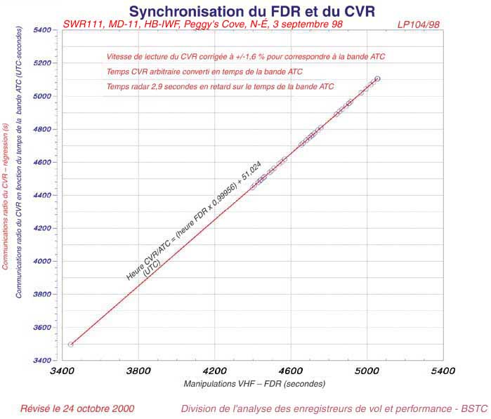 Pendant l'examen initial de l'enregistreur de données de vol (FDR), avant le repêchage de l'enregistreur de la parole dans le poste de pilotage (CVR), on a converti la référence temporelle arbitraire du FDR en UTC en appariant l'altitude-pression des données radar de Halifax—qui contenaient les marques d'horodatage UTC—à l'altitude-pression enregistrée sur le FDR. Les données de manipulation VHF du FDR ont été ensuite comparées aux communications des ATS. L'information contenue sur les bandes du FDR et des ATS était conforme à la synchronisation des communications radio. Toutefois, les heures UTC spécifiques enregistrées sur la bande des ATS étaient différentes des heures UTC obtenues des données radar; l'heure ATS avançait d'environ 2,9 secondes par rapport à l'heure radar. L'information UTC donnée par le radar était considérée beaucoup plus précise que l'information enregistrée sur la bande des ATS, en raison de la mise à jour automatique de l'horodateur UTC des données radar. Par conséquent, on a utilisé l'UTC radar pour l'analyse des enregistreurs de bord.
