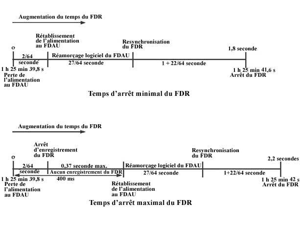 Le FDR va fonctionner pendant une interruption de l'alimentation pouvant durer jusqu'à 400 millisecondes, mais sans effectuer d'enregistrement. Une fois le courant rétabli, le FDAU avait été réamorcé, comme l'indiquent les 27 mots de 0 (durée de 27/64 seconde). On a considéré qu'il s'était agi d'un réamorçage logiciel, puisque des 0 avaient été enregistrés sans que le compteur de trames ne soit réinitialisé. Un réamorçage logiciel laisse entendre que l'interruption d'alimentation avait pu durer entre 10 et 400 millisecondes. La durée réelle de cette interruption n'a pas été déterminée. Toutefois, il est très probable qu'elle ait duré au moins 2/64 seconde puisqu'elle avait permis l'enregistrement de deux mots différents de zéro, représentant une perte du signal du FDAU. Par conséquent, à la suite de la perte du signal du FDAU, aucune donnée n'avait été enregistrée pendant une période maximale de 0,37 seconde (0,4 moins 2/64).