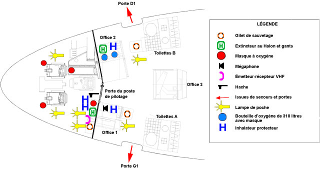Les générateurs par voie chimique et les masques à oxygène étaient montés dans des boîtes à oxygène se trouvant dans les porte-bagages de la cabine, les consoles des agents de bord et les toilettes. Ils étaient répartis de la façon suivante :
