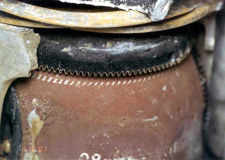 On a déterminé que le cercle d'empreintes sur la surface de la boule provenait d'un contact avec les dents en forme de cloche du secteur denté avant de référence de tangage. L'indentation au centre des empreintes des dents d'engrenage correspondait à un contact avec le centre du secteur denté qui, lui aussi, a été poussé de force contre la boule. Compte tenu de l'aspect caractéristique des empreintes, on a déterminé que la boule s'était figée dans cette position au moment de l'impact.