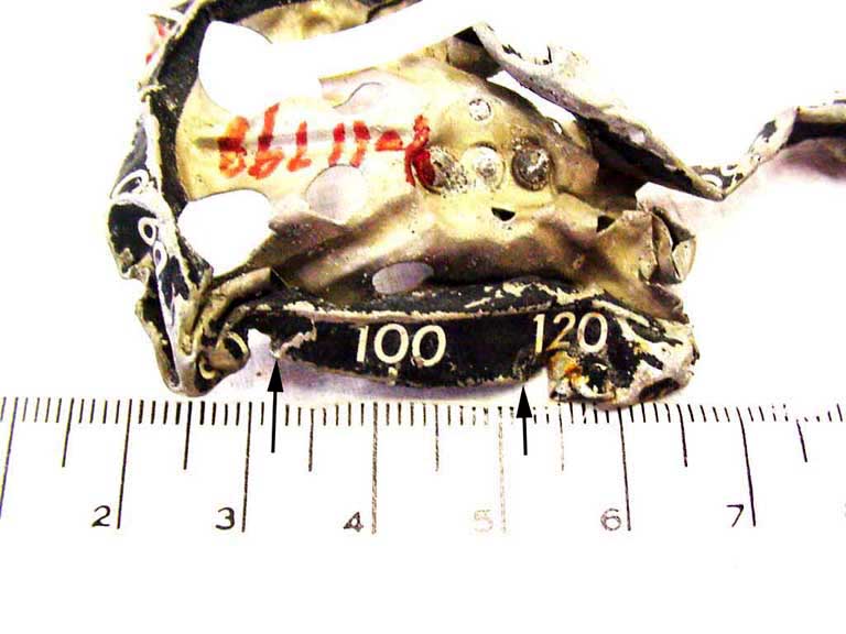 La plaquette dans laquelle se trouvait l'éclairage intégré au sommet de l'indicateur était déplacée, et certaines de ses parties avaient disparu. Le reste de la plaquette était encore relié à l'indicateur par deux conducteurs. Il n'y avait aucune des lampes intégrées. Le drapeau d'avertissement de panne et le bouton d'érection rapide (normalement situé dans le coin inférieur droit) étaient absents. Bien que la plus grande partie de l'électro-aimant qui actionnait le drapeau d'avertissement de panne n'ait pas été retrouvée, un morceau de cet électro-aimant était encore attaché au coin supérieur gauche du châssis. La maquette de l'avion n'a pas été retrouvée.