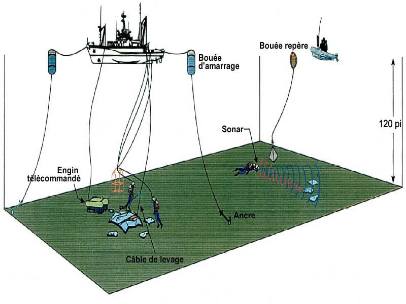 - le président du groupe sur place (SGC) représentant le BST, plongeur autonome qui est opérateur de sonar à balayage latéral (SSS) et de système de localisation acoustique;