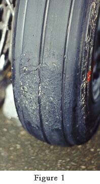 L'examen des pneus a révélé que les quatre pneus des deux roues jumelées du train d'atterrissage principal présentaient tous une zone de dévulcanisation (voir figure 1), ce qui est un signe d'aquaplanage. Quand ce phénomène se produit, les pneus de l'avion n'adhèrent plus du tout à la surface de la piste et continuent à glisser sur l'eau jusqu'à ce qu'une diminution de la vitesse leur permette de reprendre contact avec la surface de la piste. Pendant un aquaplanage dynamique total, les pneus n'adhèrent plus à la piste et se déplacent sur l'eau, ce qui se traduit par une perte complète de friction du pneu au point où il n'y a même plus de rotation de la roue. Sur une piste humide, là où il n'y a pas suffisamment d'eau pour provoquer un aquaplanage dynamique, il peut y avoir aquaplanage visqueux. Ce terme désigne l'action glissante ou lubrifiante normale de l'eau. Un aquaplanage visqueux ne réduit pas la friction au point de provoquer un arrêt de la rotation des roues. Par ailleurs, il peut y avoir aquaplanage avec dévulcanisation si une roue bloquée patine sur une piste très glissante recouverte d'eau ou de névasse à une vitesse supérieure à 20 noeuds, alors que la chaleur générée par la friction produit de la vapeur qui commence à dévulcaniser le caoutchouc, sur une partie du pneu, pour le ramener à son état d'avant-vulcanisation. L'augmentation de la distance d'arrêt en cas d'aquaplanage ne peut être prédite avec exactitude, mais on a jugé qu'elle pouvait atteindre les 700 %. Les tableaux de performances de l'avion indiquent que si la masse à l'atterrissage est de 22 198 livres, l'avion a besoin d'une distance d'atterrissage de 4 400 pieds pour s'immobiliser. Cette distance a été calculée pour un atterrissage sur une piste sèche et dégagée.