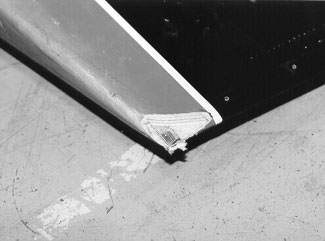 La surface fraîchement égrisée de l'intrados du saumon de l'aile droite de l'appareil était typique des dommages résultant du contact du saumon de l'aile avec le sol pendant un récent cheval de bois ou une forte embardée à gauche. L'absence de saleté et de débris à la surface de l'éraflure indique que les dommages ont été provoqués par un contact avec une surface en asphalte ou en béton. Bien qu'il ait été impossible de quantifier les forces exercées lors de l'éraflure du saumon de l'aile, en se fiant uniquement à son aspect, on peut conclure que les forces appliquées lors de l'éraflure étaient suffisamment importantes pour fissurer et affaiblir l'un des longerons de l'aile droite ou les deux. L'absence de tout signe de frottement sur les surfaces fracturées indique également que les criques dans les longerons étaient récentes, datant peut-être du dernier décollage ou du dernier atterrissage. Si les longerons en bois avaient comporté des criques depuis longtemps, les surfaces fracturées auraient probablement comporté des signes de frottement dus à leur frottement mutuel lors des charges normales en vol.