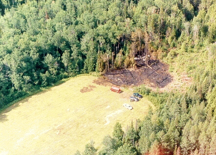 D'après les renseignements recueillis sur les lieux, l'avion en vol rectiligne a d'abord percuté deux arbres de l'aile gauche, a pivoté vers la gauche, puis a percuté d'autres arbres tout en se déplaçant latéralement de gauche à droite. L'avion se déplaçait ainsi quand il a percuté le sol. L'avion a fini sa course à l'endroit; son aile droite rompue à l'emplanture reposait sur un tronc d'arbre. Un violent incendie alimenté par le carburant a éclaté à l'impact ou tout de suite après et a été plus violent dans la cabine de l'avion. L'incendie a éclaté avant que les occupants évacuent l'appareil.