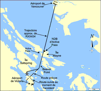 Au moment où l'avion approchait d'Active Pass, l'équipage a fait un appel radio visant à informer les aéronefs évoluant dans la région de Victoria qu'il avait l'intention d'intégrer le circuit de base à gauche pour atterrir sur la piste 09 de l'aéroport de Victoria. Quelques minutes plus tard, l'équipage a fait un deuxième rapport de position pour signaler qu'il lui restait 10 milles marins (nm) à parcourir avant d'atterrir sur la piste 09. L'équipage a fait un dernier rapport de position à proximité de Beaver Point, au bout sud-est de l'île Saltspring. Les données radar révèlent que l'avion a alors effectué un virage à droite assez prononcé, au voisinage de Beaver Point, et qu'il s'est ensuite dirigé vers une zone montagneuse au nord de l'aéroport de Victoria (voir la ligne pleine sur la Figure 1).