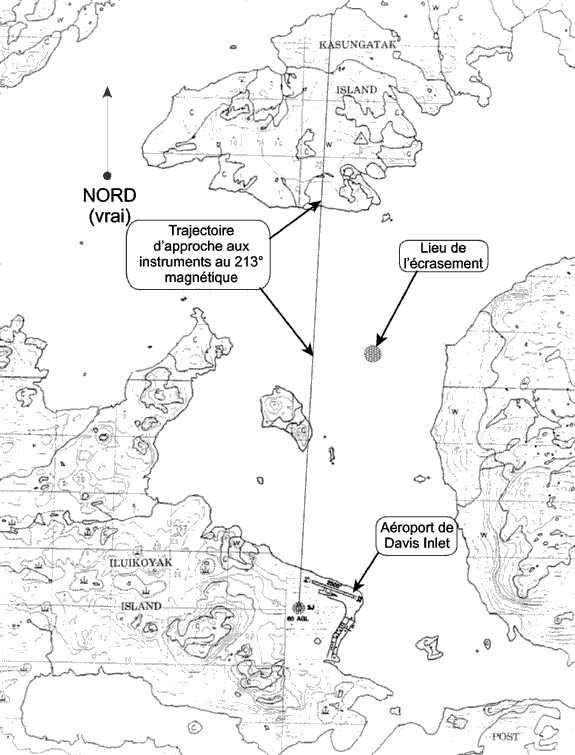 L'aéroport de Davis Inlet possède une seule procédure d'approche aux instruments : la procédure d'approche au radiophare non directionnel (NDB) A. Cette approche se sert du NDB de Davis Inlet, qui est situé au sud du prolongement de l'axe de piste. La procédure d'approche publiée est une approche indirecte. La MDA est de 1 340 pieds asl (1 295 pieds au-dessus du sol), et la visibilité consultative publiée est de 3 sm. L'approche se fait par le nord-nord-est de l'aéroport et se déroule en grande partie au-dessus de l'océan. Le point d'approche interrompue est au NDB (voir l'annexe C).