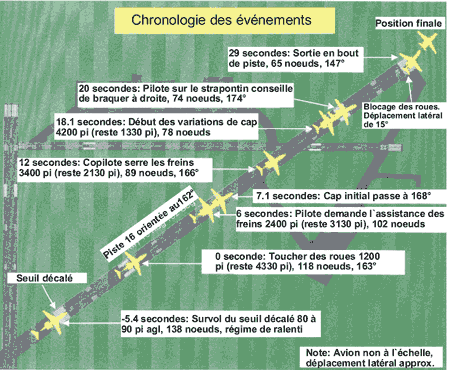Au toucher des roues du train principal, le cap de l'appareil a commencé à augmenter progressivement, passant de 163°M à 168°M en 7 secondes. Le train avant a touché le sol 2 secondes après le train principal, puis le commandant de bord a serré les freins; 6 secondes après le toucher des roues, le commandant de bord a senti que le freinage n'était pas efficace et il s'est empressé de demander au premier officier de l'aider à freiner. L'appareil se trouvait alors à quelque 2 400 pieds au-delà du seuil décalé de la piste, à une vitesse décroissante de 102 KIAS et sur un cap au 168°M. L'appareil a poursuivi sa course sur la piste, près de l'axe de piste, la partie avant orientée de 4 à 7° à droite du cap de piste. Une pression maximale continue a été exercée sur les pédales de frein pendant toute la durée du roulage au sol et, même si l'équipage a signalé avoir utilisé le circuit de freinage auxiliaire alors que l'appareil se trouvait à quelque 2 900 pieds de l'extrémité de la piste, il a senti qu'aucun des circuits de freinage qu'il utilisait n'avait un effet sur l'appareil. Le premier officier a confirmé avoir commencé à exercer une pression maximale sur les pédales de frein environ 12 secondes après le toucher du train principal, à 3 400 pieds du seuil décalé de la piste (à 2 130 pieds de l'extrémité de la piste), alors que l'appareil roulait à 89 KIAS. À quelque 1 330 pieds de l'extrémité de la piste, le cap de l'appareil s'est mis à varier, passant de 170°M à 178°M, avant de diminuer jusqu'à 147°M. L'appareil est sorti en bout de piste, légèrement à gauche de l'axe de piste, sur un cap au 147°M et à une vitesse de 65 KIAS. (Voir le schéma de l'atterrissage à l'Annexe A).