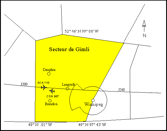 Les deux avions étaient placés sous la responsabilité du contrôleur chargé du secteur supérieur en route de Gimli à l'intérieur du centre de contrôle régional (ACC) de Winnipeg (voir l'annexe A). CDN 987, qui se dirigeait vers l'ouest au FL 390, a contacté le contrôleur de Gimli à 10 h 46 min 21, heure normale du Centre (HNC)Note de bas de page 1, peu après que ce dernier eut pris son poste vers 10 h 45. Le contrôleur du secteur de Gimli a identifié l'avion au radar, a vérifié la route suivie dans le secteur qui était indiquée sur la fiche de progression de vol et a confirmé qu'à cette altitude, aucun autre appareil n'entrait en conflit avec CDN 987. ACA 118, qui se dirigeait vers l'est au FL 370, a contacté le contrôleur du secteur de Gimli à 10 h 53 min 25 et a été identifié au radar. Sa fiche de progression de vol a été annotée en conséquence.